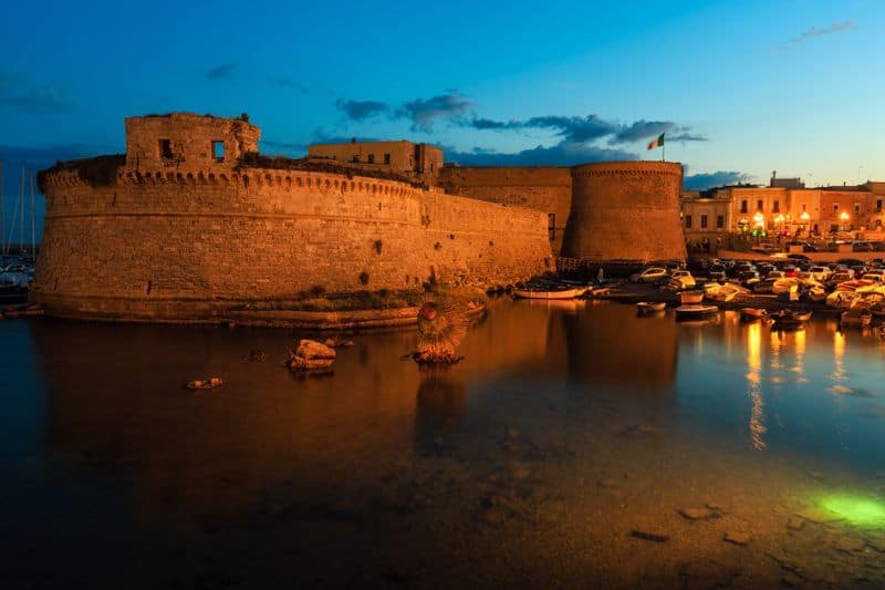 Il castello di Gallipoli, circondato quasi completamente dal mare, si erge con la sua imponente mole all'estremità orientale dell'isola che ospita il borgo antico.